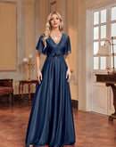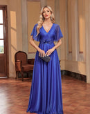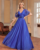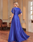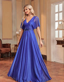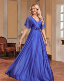 BluePlum Elegant Royal Shining Applique V-neck Formal Evening Dress 2024 Women Short Sleeves Mermaid Wedding Party Long Dresses | Blue Plum