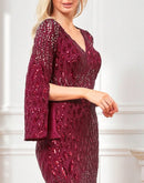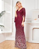 Features: This stunning BluePlum Elegant Sequin Burgundy Red Evening Dress is the perfect choice for formal occasions, featuring a modern style and luxurious details. The dress is designed with a flattering V-neckline and full sleeves, making it ideal for all ages. Made with high-quality spandex and polyester fabric, it offers comfort and elegance in every wear. With its striking straight silhouette and natural waistline, this maxi dress will make you shine at any prom or evening party.