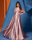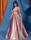 BluePlum Elegant Short Sleeve Pink Satin Formal Evening Dress Luxury L