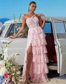 Luxury Oblique Shoulder Pink Slit Chiffon Mermaid Evening Dress | Blue Plum