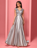 - Luxury Blueplum Gold Satin V-Neck Sequin Evening Dress | Blue Plum