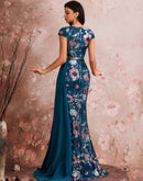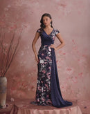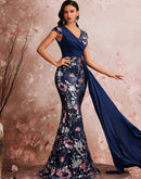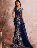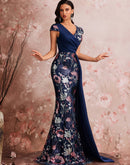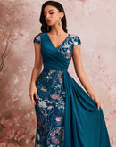 Lady's spring and summer elegant high-quality colorful embroidered sequin pieces are spliced together. This is a luxurious V-necked pleated dress suitable for formal evening events. | Blue Plum