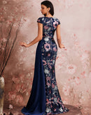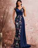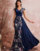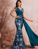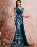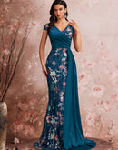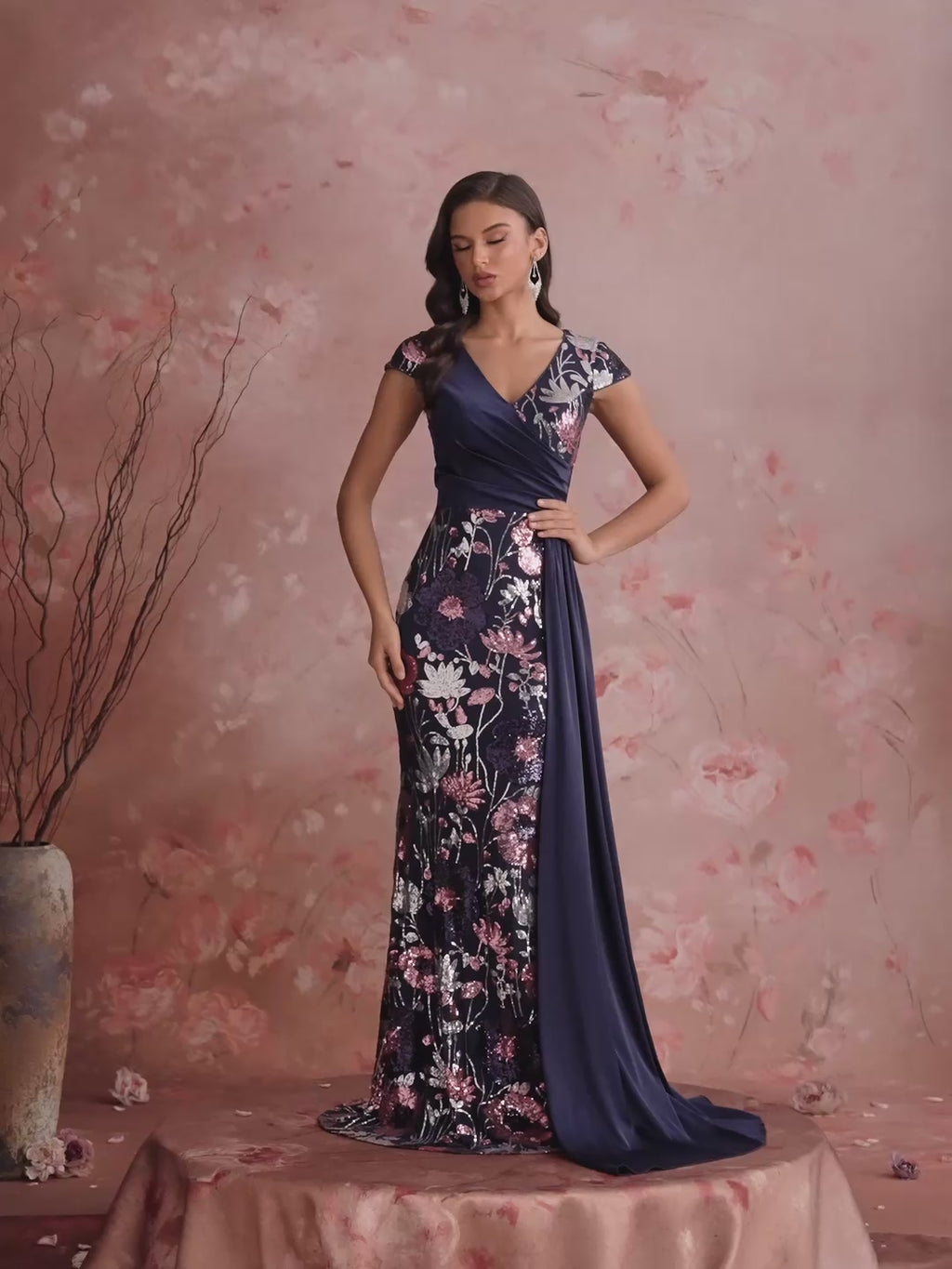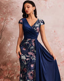 - Lady's spring and summer elegant high-quality colorful embroidered sequin pieces are spliced together. This is a luxurious V-necked pleated dress suitable for formal evening events. | Blue Plum