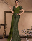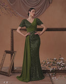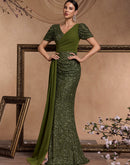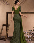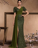 Ladies' spring and summer sequin patchwork V-neck short-sleeved evening dress | Blue Plum