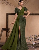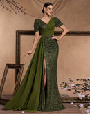 Ladies' spring and summer sequin patchwork V-neck short-sleeved evenin