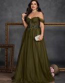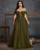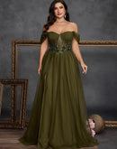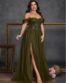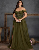 large-sized solid-color off-the-shoulder slit mesh evening dress with