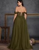 large-sized solid-color off-the-shoulder slit mesh evening dress with an elegant pleated A-line design- BLUEPLUM Luxury | Blue Plum