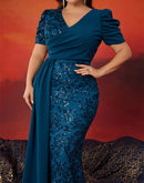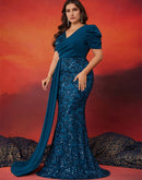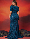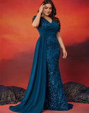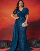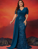 BluePlum Plus Size Elegant V-neck Sequins Evening Dress Women Short Sleeves Mermaid Formal Luxury Party Streamer Prom Dress | Blue Plum