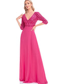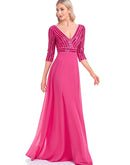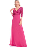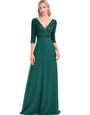 BluePlum Elegant Sequin Long Sleeve Formal Evening Dress Chiffon Blue A- line V-Neck Wedding Party Graduation Prom Dress For Women | Blue Plum