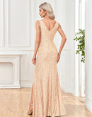Features: This elegant V-neck sequin evening dress showcases a modern style with vintage elements, perfect for all ages. Designed with a built-in bra and sleeveless style, it offers comfort without compromising on glamour. The natural waistline and floor-length silhouette enhance your figure, making it ideal for formal evening occasions. Customization is available to ensure a perfect fit.