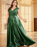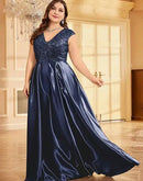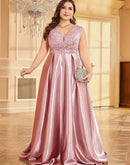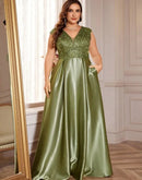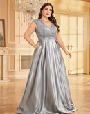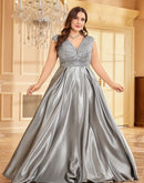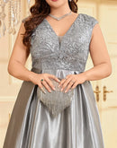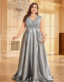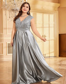 BluePlum Plus Size Luxury Grey Satin V-Neck Evening Dress Elegant 2024 Women Wedding Party Prom Floor Lenght Cocktail Dress | Blue Plum